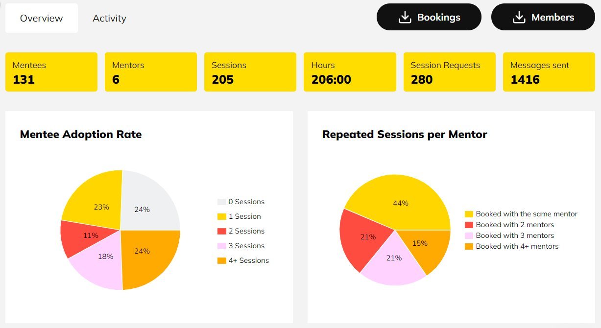 From here, you can see which mentees have had the least amount of sessions. Consider sending them a message to prompt them to book, mentor suggestions or mentorship tips.